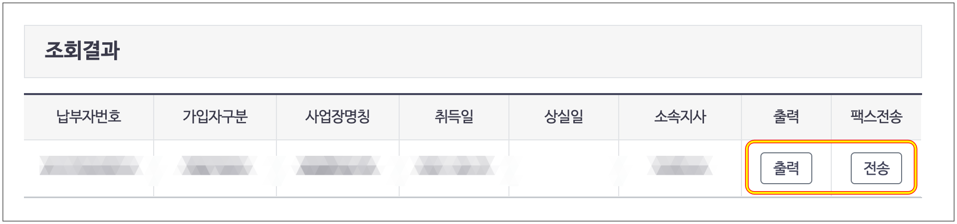조회를 누르면 하단에 조회 결과가 보여집니다. 여기에서 출력 또는 팩스전송이 가능합니다.