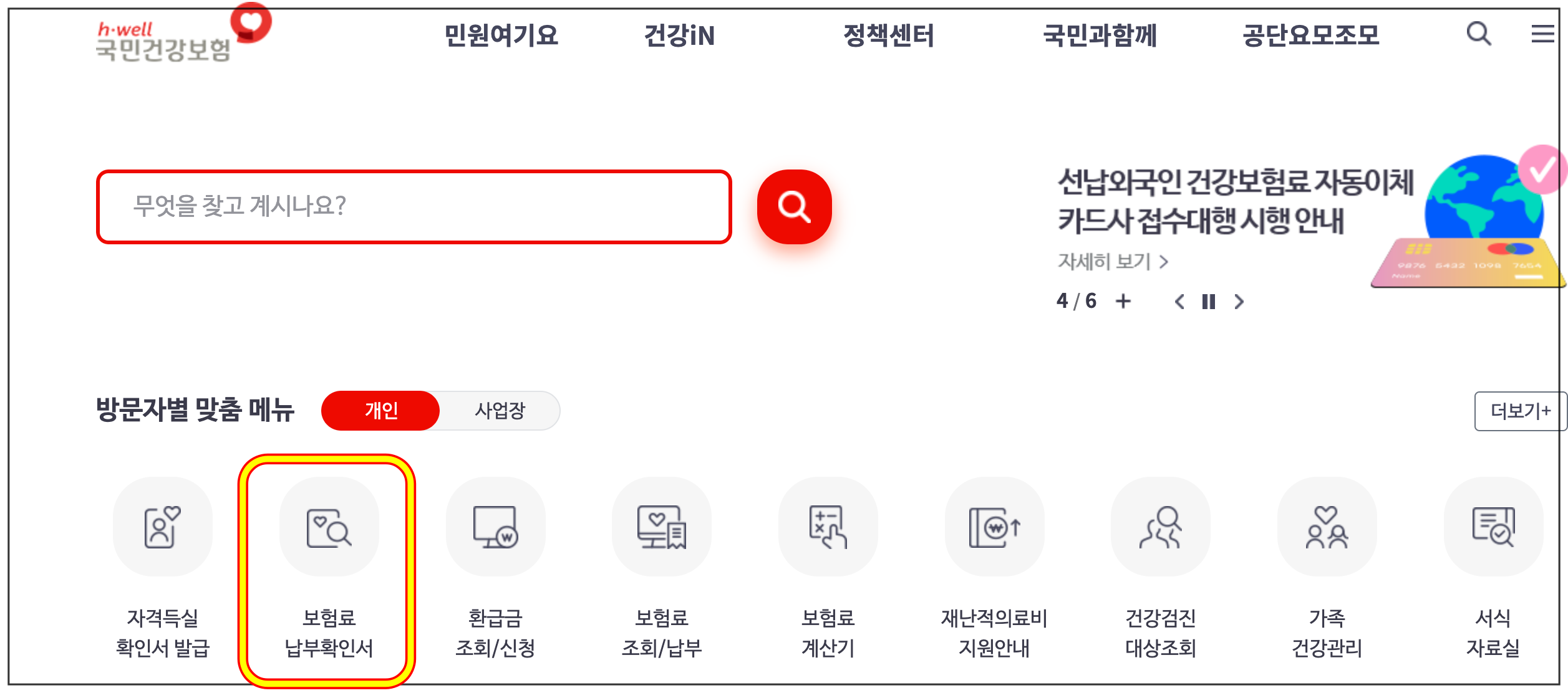 ※ 홈페이지 메인 화면에 [보험료 납부확인서] 메뉴가 보이지 않는다면, [ 민원여기요 ] > [증명서 발급/확인] > [보험료 납부확인서]를 클릭하시면 됩니다.