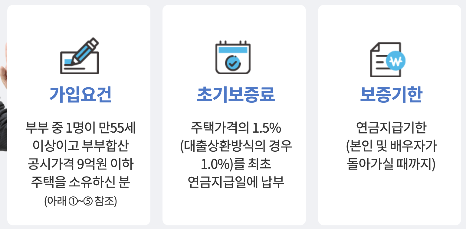 실제 거주를 하고 있어야하며 해당 주택이 경매나 압류 등 소유권에 대한 권리침해, 전세권 등 제한물권이 설정되어 있는 경우에는 가입이 불가하니 참고하시기 바랍니다. 또한 주택에 대한 기대출이 있는 경우, 대출액이나 상환능력에 따라 가입 여부가 결정되기 때문에 한국주택금융공사에 문의하시기 바랍니다.
