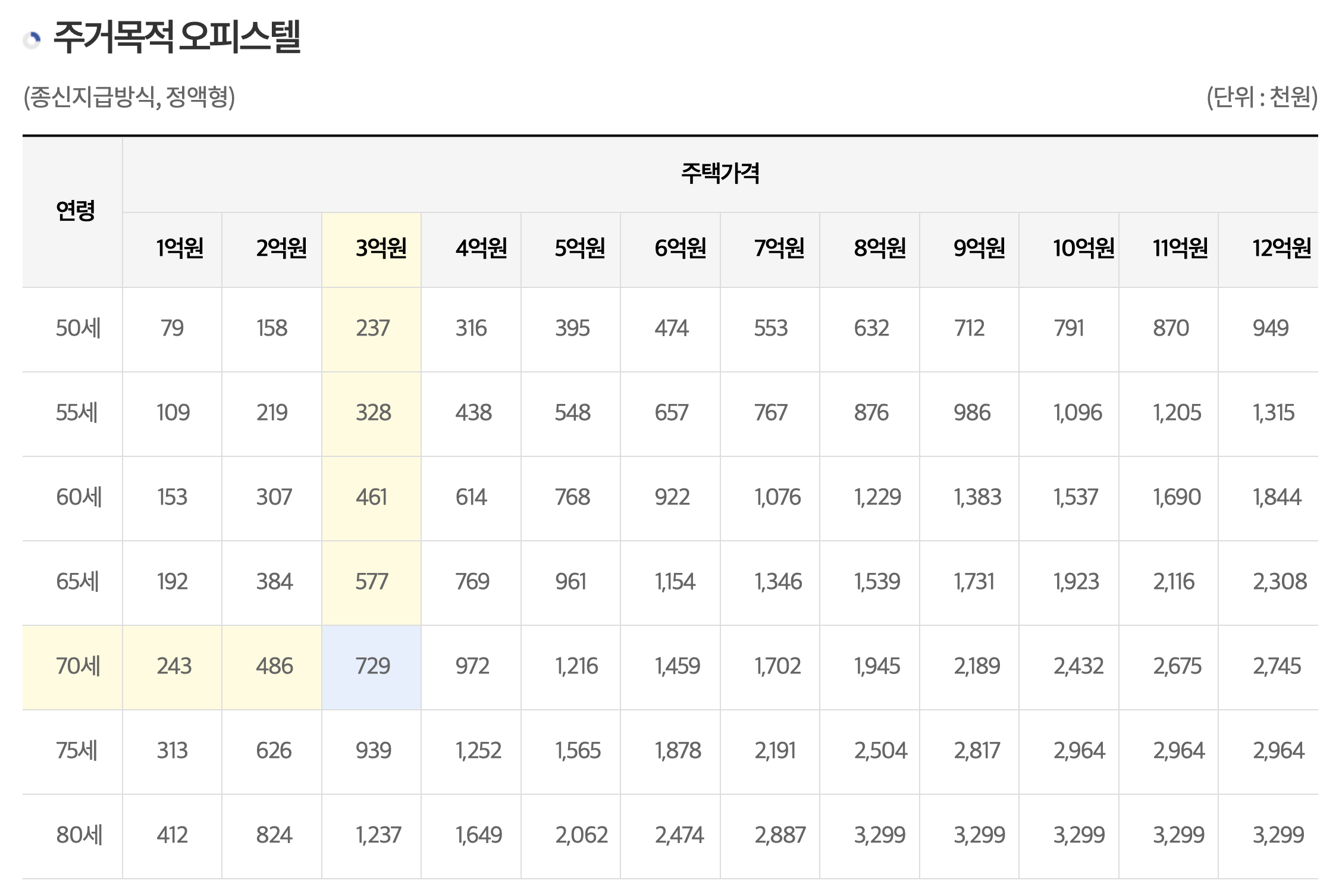70세, 3억원 주택 기준응로 매월 72만 9천원을 수령받을 수 있습니다.