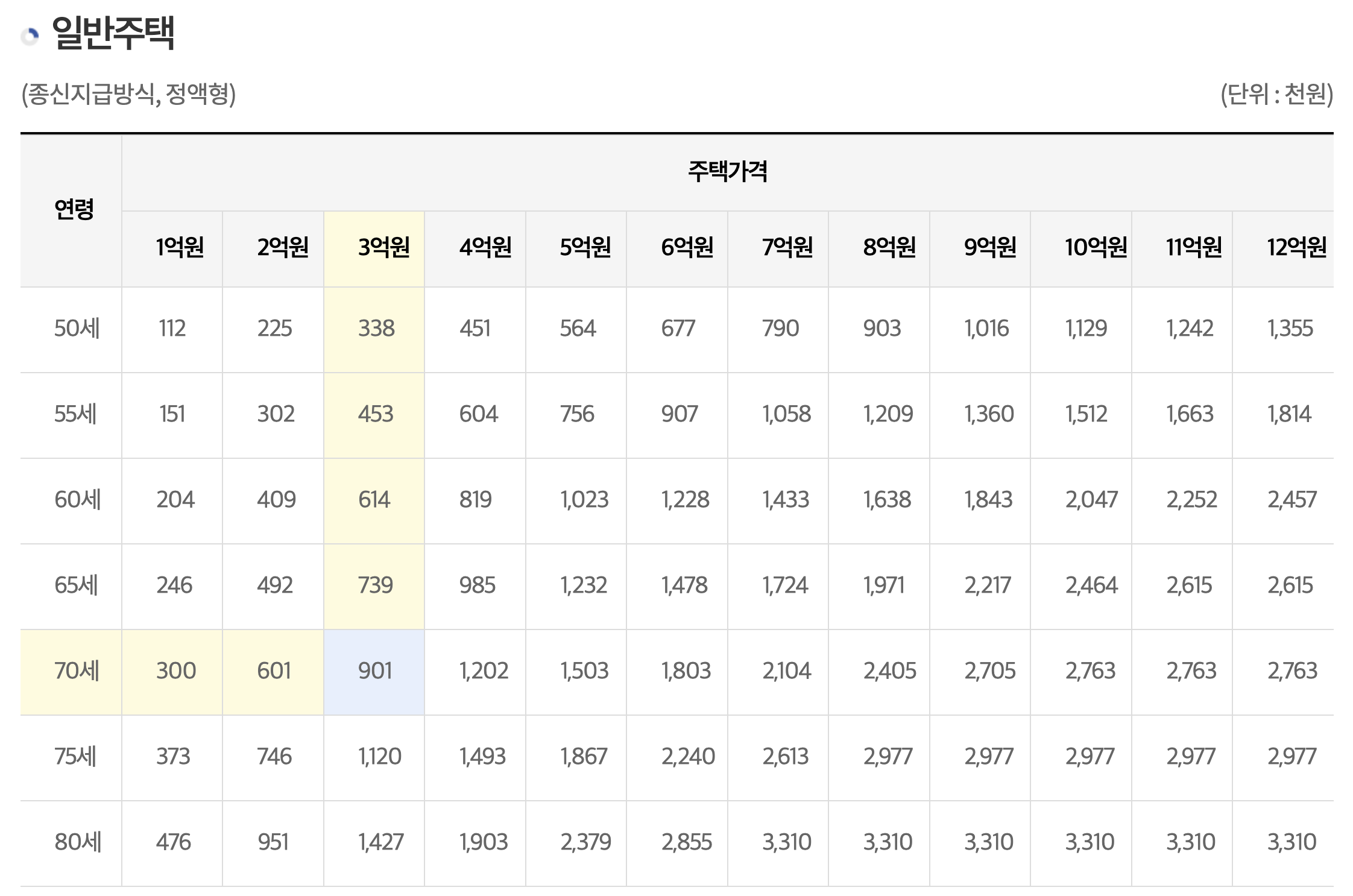 예를들어보면 일반주택 종신지급방식의 경우, 70세 3억원 주택 기준으로 매월 90만 1천원을 수령받게되는 것을 위 표를 통하여 확인할 수 있습니다.
