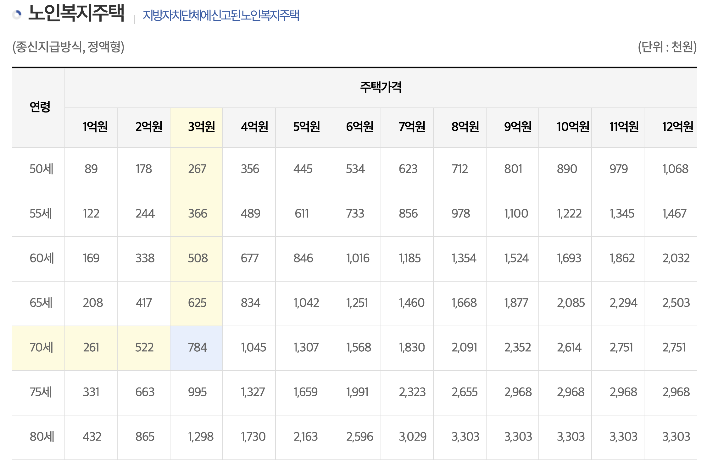 (지방자치단체에 신고된 노인복지주택) 70세, 3억원 주택 기준으로 매월 78만 4천원을 수령받을 수 있습니다.