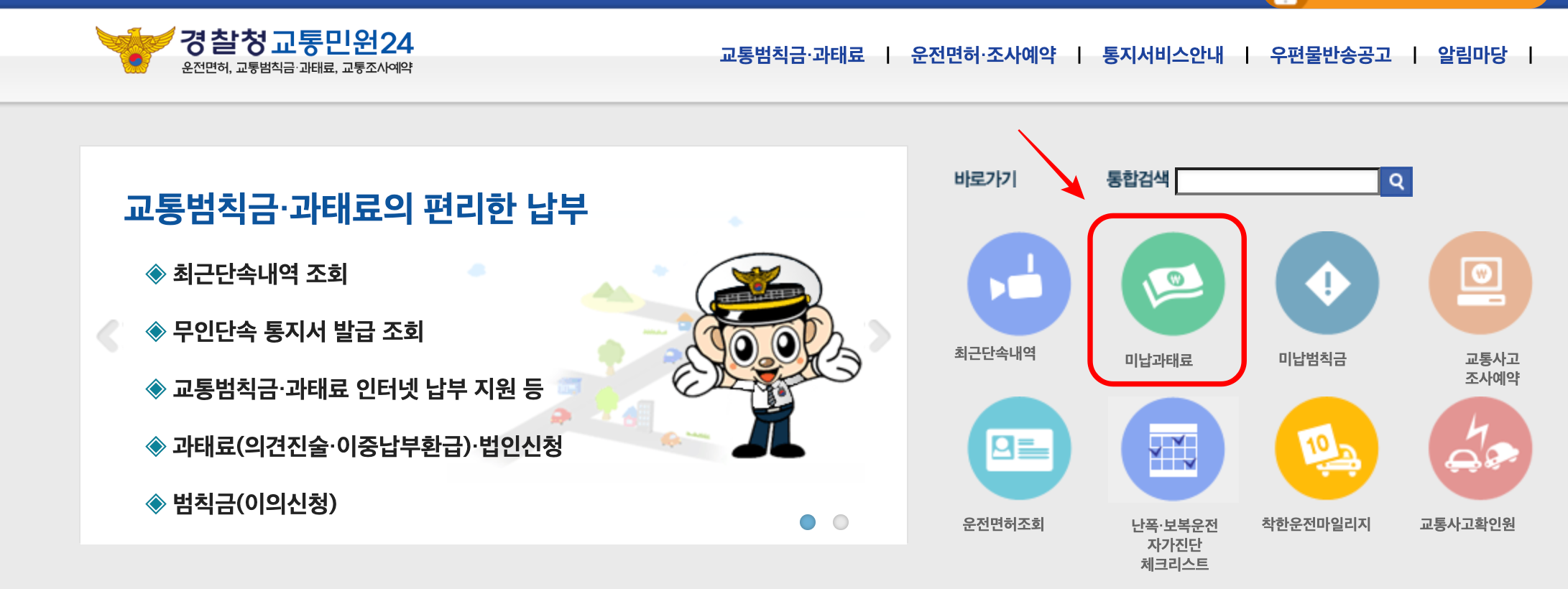 Step 2. 메인 화면에 있는 메뉴 중, [미납과태료]를 클릭해주세요.