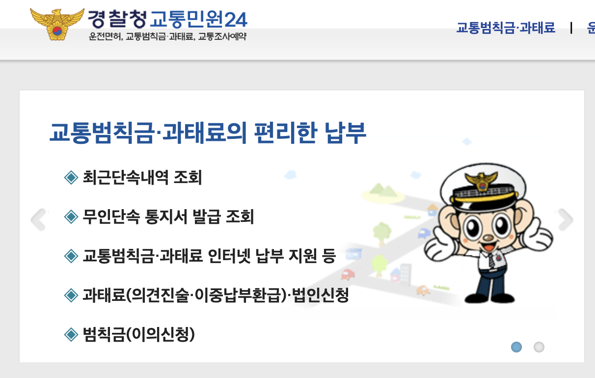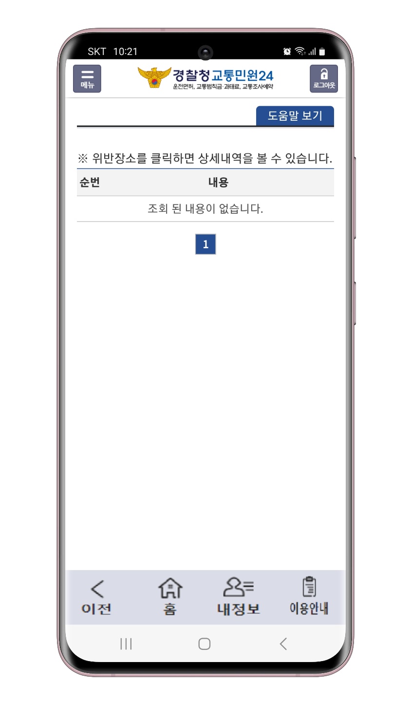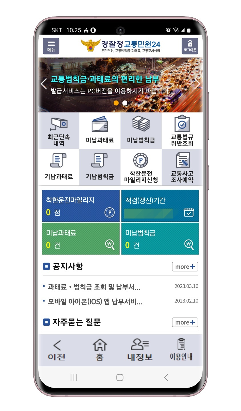이 밖에도 최근단속내역, 미납범칙금, 교통법규 위반조회, 기납과태료, 적검(갱신)기간도 조회할 수 있습니다.
