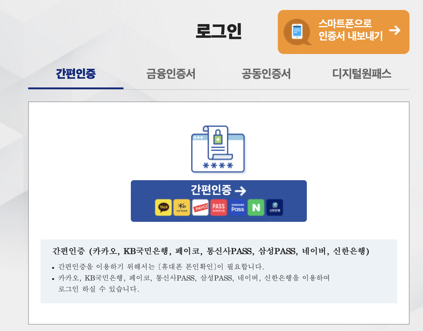 Step 3. 간편인증 / 금융인증서 / 공동인증서 / 디지털원패스 중 한 가지 방법을 선택하여 로그인을 진행해주세요.