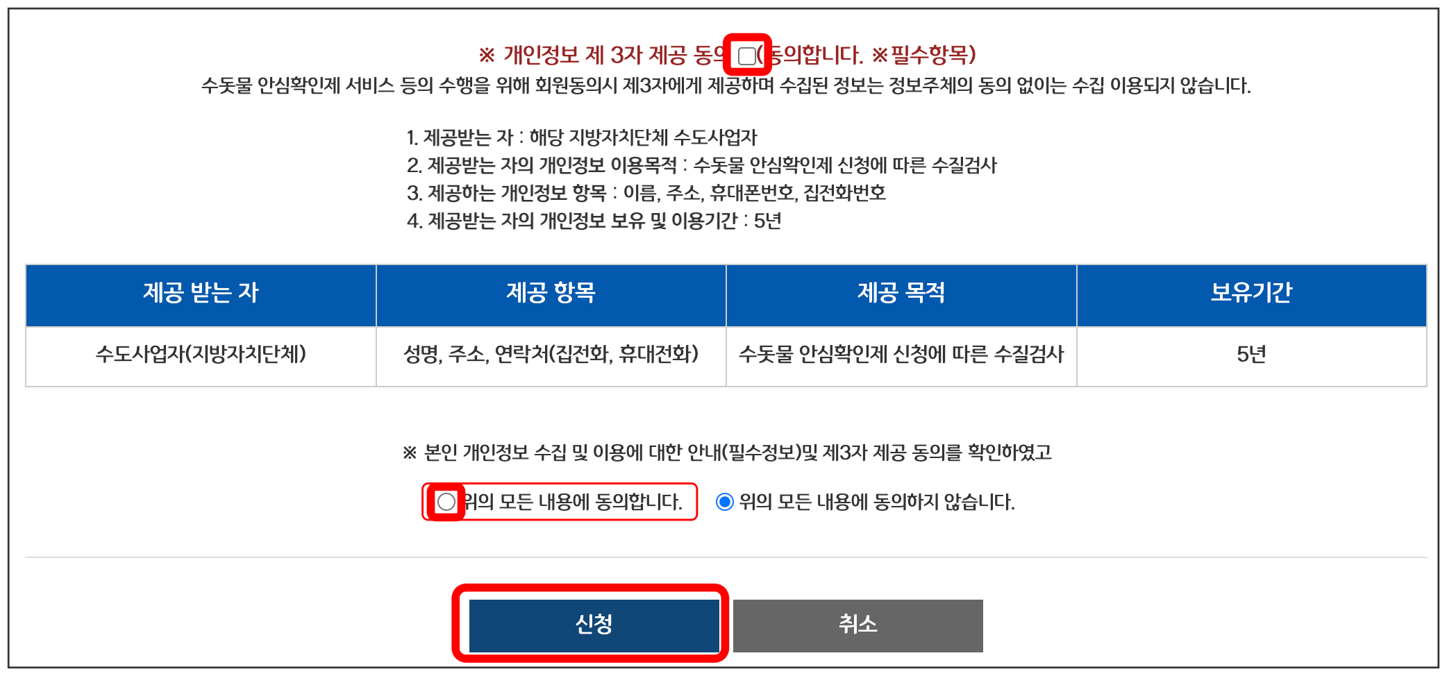 Step 3. 수질검사 신청이 가능한 지역이라면 하단 [수질검사 신청하기]를 클릭해주세요. 그리고 이용약관 동의 후, 신청을 해주세요.