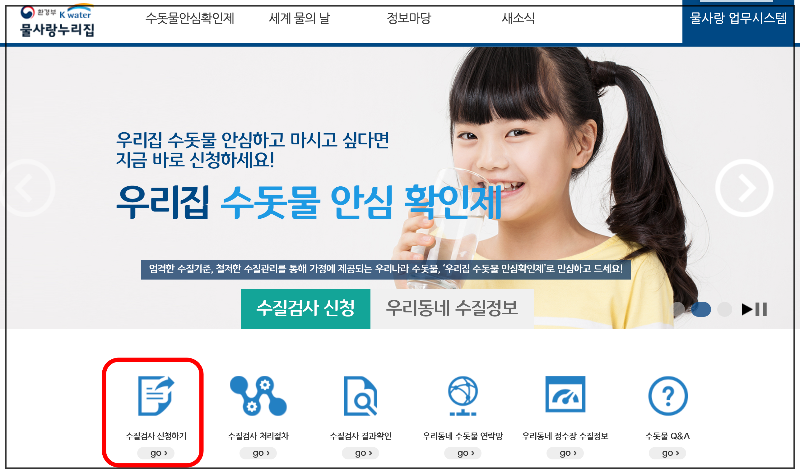 우리집 수돗물 수질이 궁금하신가요? 안심하고 마시고 싶다면, 안심하고 사용하고 싶다면 수돗물 안심확인제를 신청해보세요. 인터넷이나 전화로 수질검사를 신청하면 해당지역 담당공무원이 직접 방문하여 무료로 수도꼭지 수질검사를 실시해줍니다. 검사 후 결과공지까지는 20일정도 소요되니 우리집 수돗물 수질이 궁금하시다면 신청하여 검사 받아보시기 바랍니다.