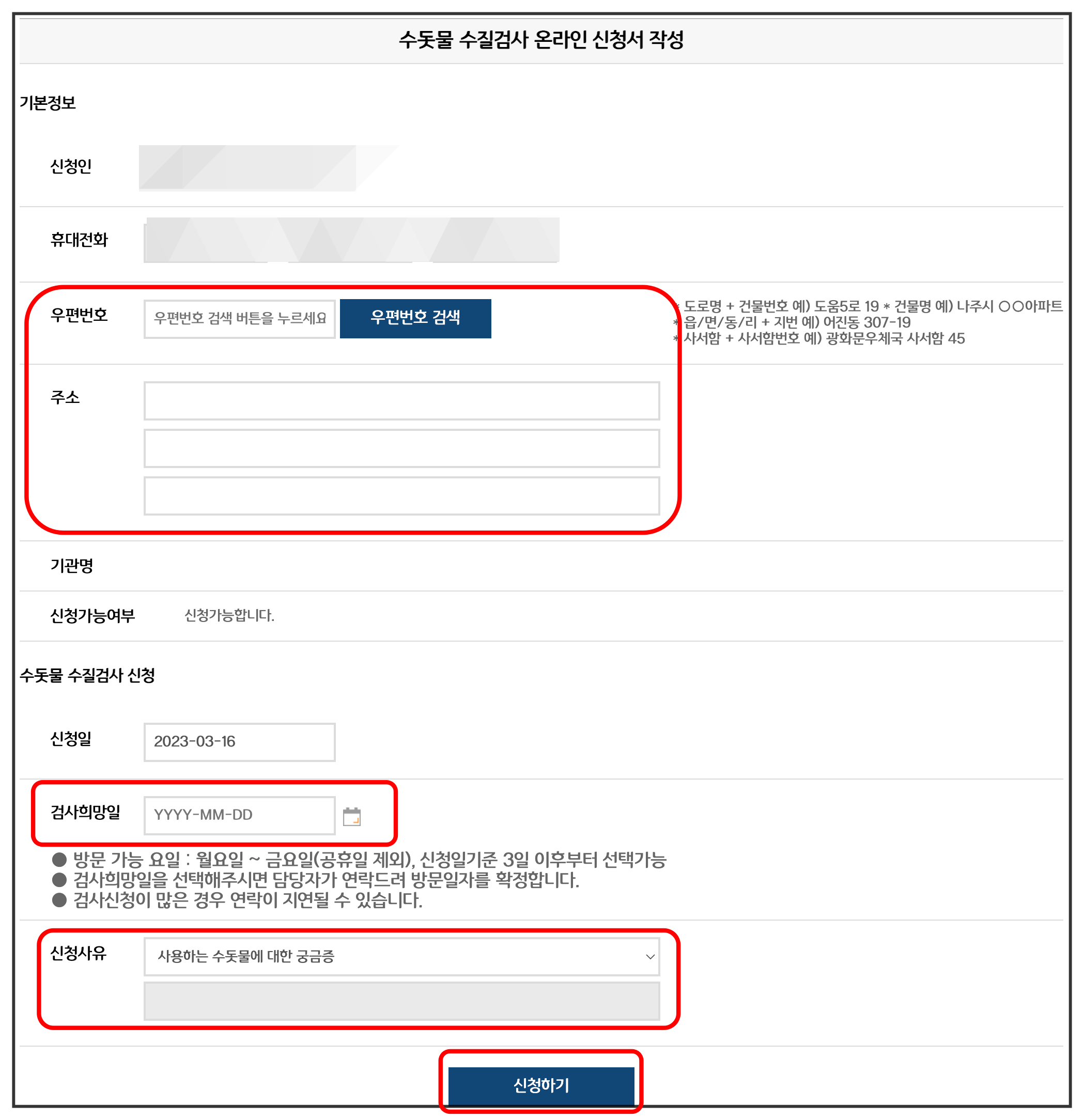 Step 4. 본인인증 후, 온라인신청서를 작성합니다. 주소 입력 후, 검사희망일 선택 - 신청사유를 적고 신청하기를 클릭하면 신청 완료됩니다.