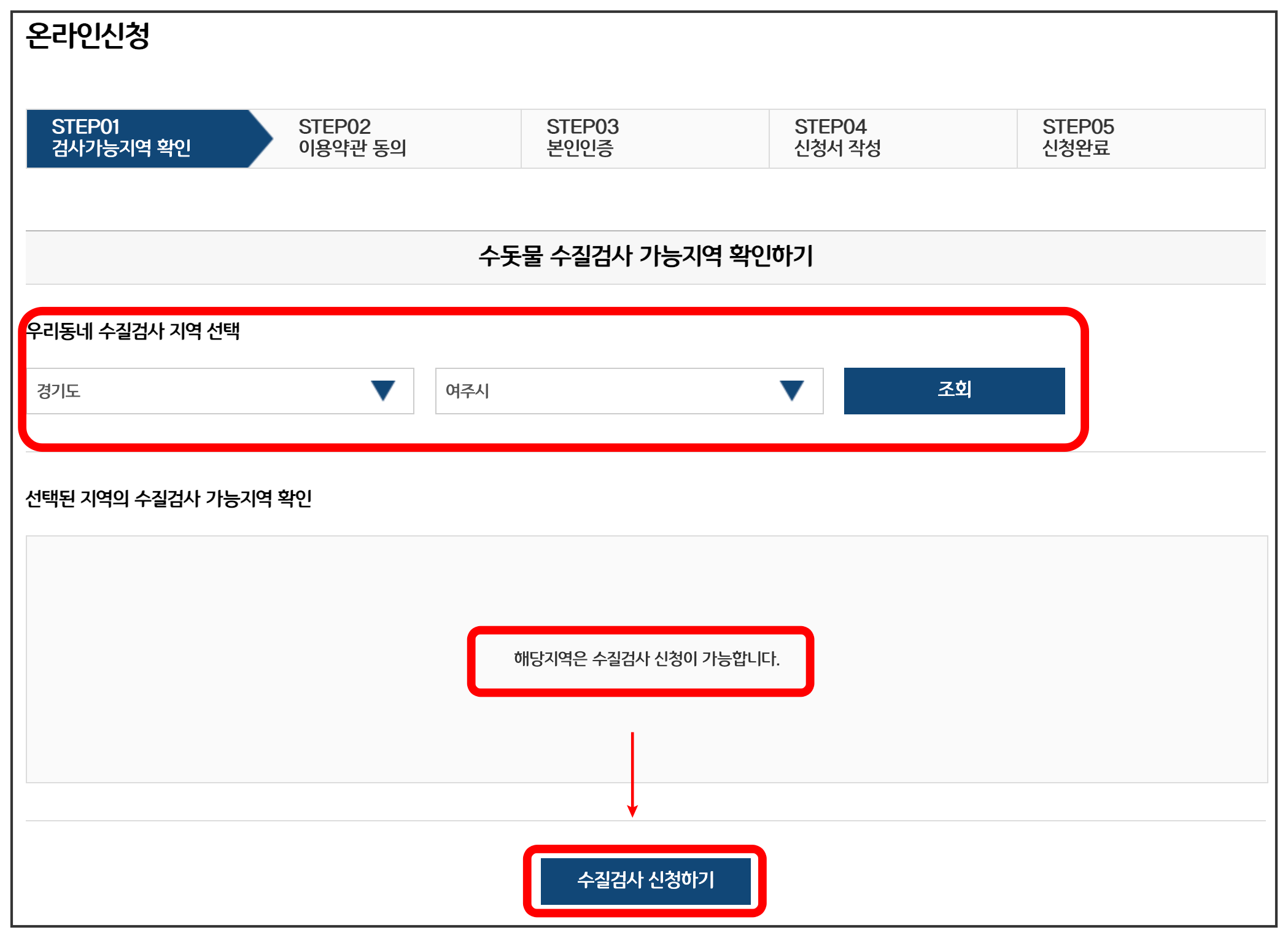 Step 2. 우선, 검사가능지역인지 확인을 해주세요. 시/도 선택 > 시/군/구 선택 후, 조회를 눌러 수질검사 가능지역인지 확인해주세요.