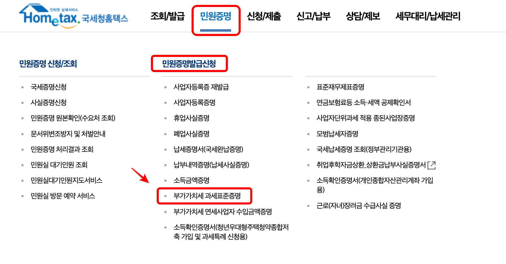 2. [민원증명] > [민원증명발급신청] > [부가가치세 과세표준증명] 메뉴를 선택해 주세요.