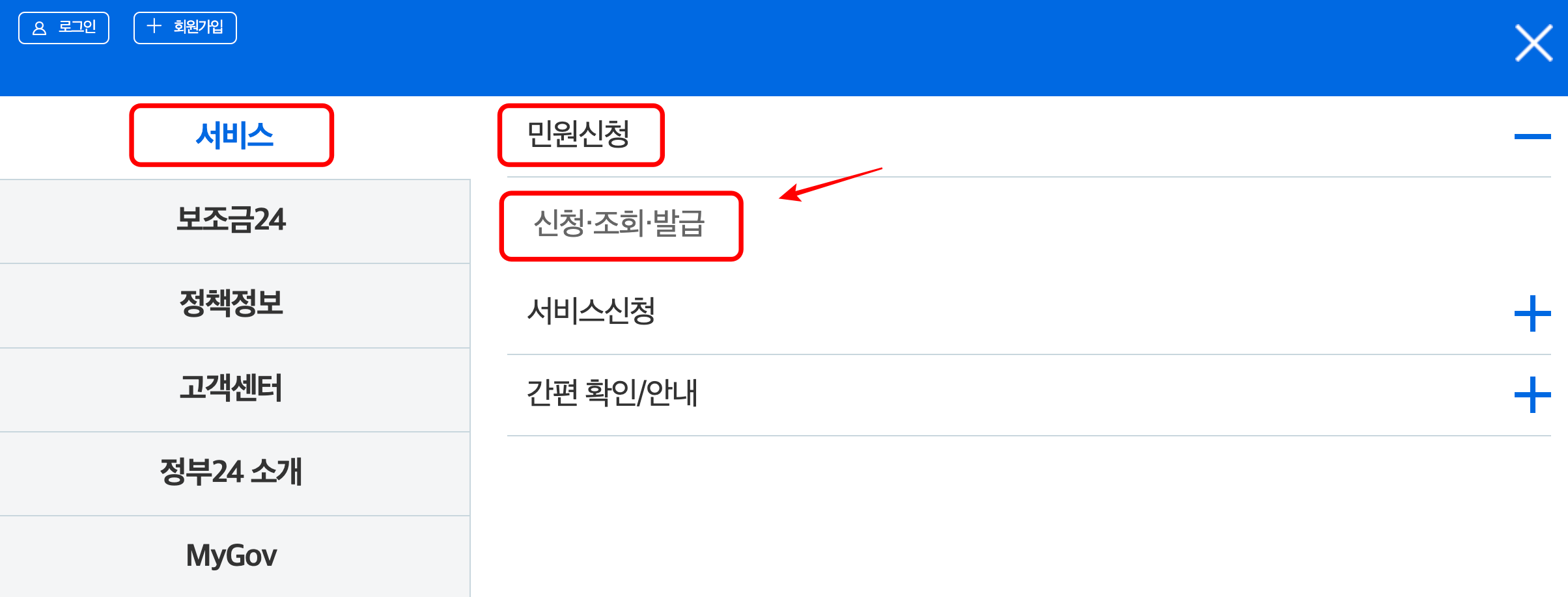 2. 서비스 > 민원신청 > 신청.조회.발급 메뉴를 클릭해주세요.