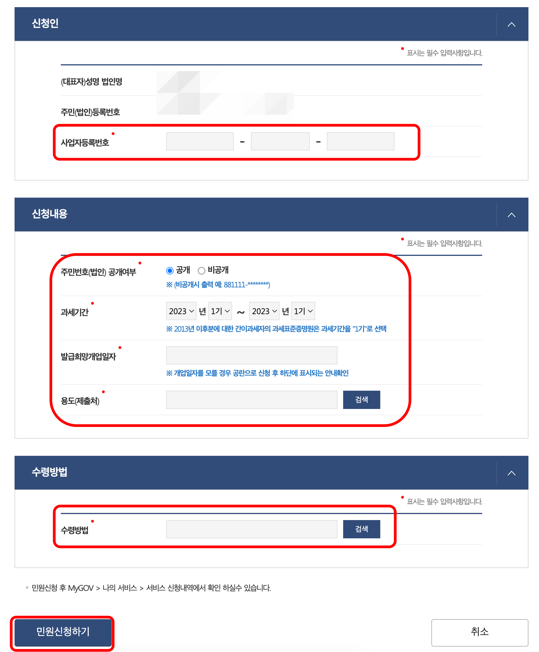 5. 사업자 등록번호입력, 주민번호 공개여부 공개/비공개 선택, 과세기간, 발급희망개업일자, 용도(제출처)를 입력하고 [민원 신청하기]를 누르면 됩니다.