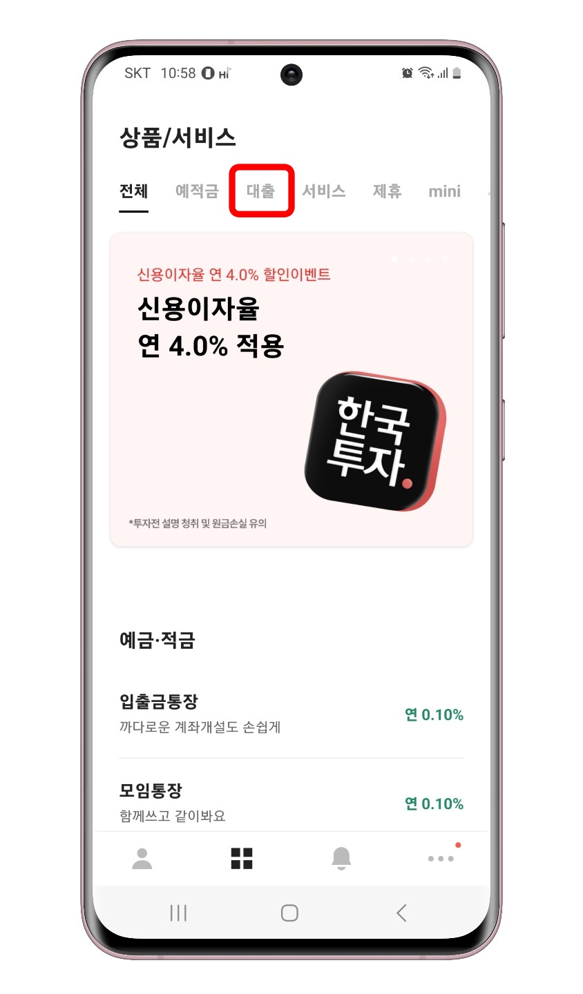 Step 3. [ 상품/서비스 ] > [대출] > [ 마이너스 통장대출 ] 메뉴를 선택해주세요.