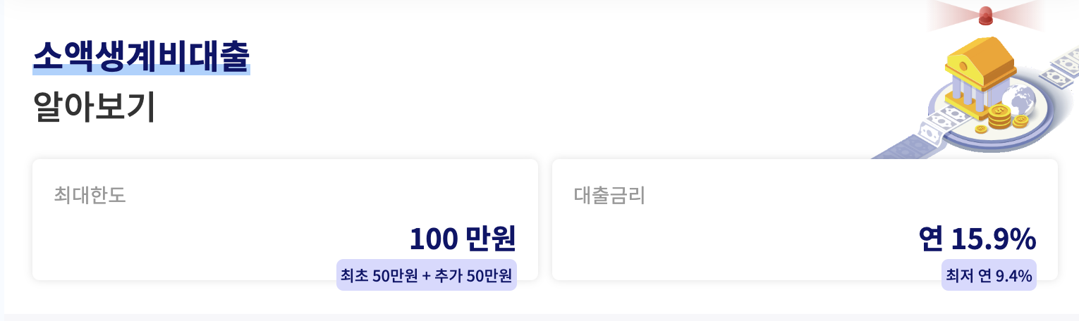 소액생계비대출 나도 받을 수 있는지 궁금하시죠? 제가 알려드리겠습니다. 급전이 필요한 취약계층에게 당일 대출해주는 소액생계비대출! 최대 100만원을 당일 대출해주는 이 긴급생계비대출에 상담신청자가 몰리고 있습니다. 신용평점 하위 20%이며 연소득 3,500만원 이하라면 가능합니다.