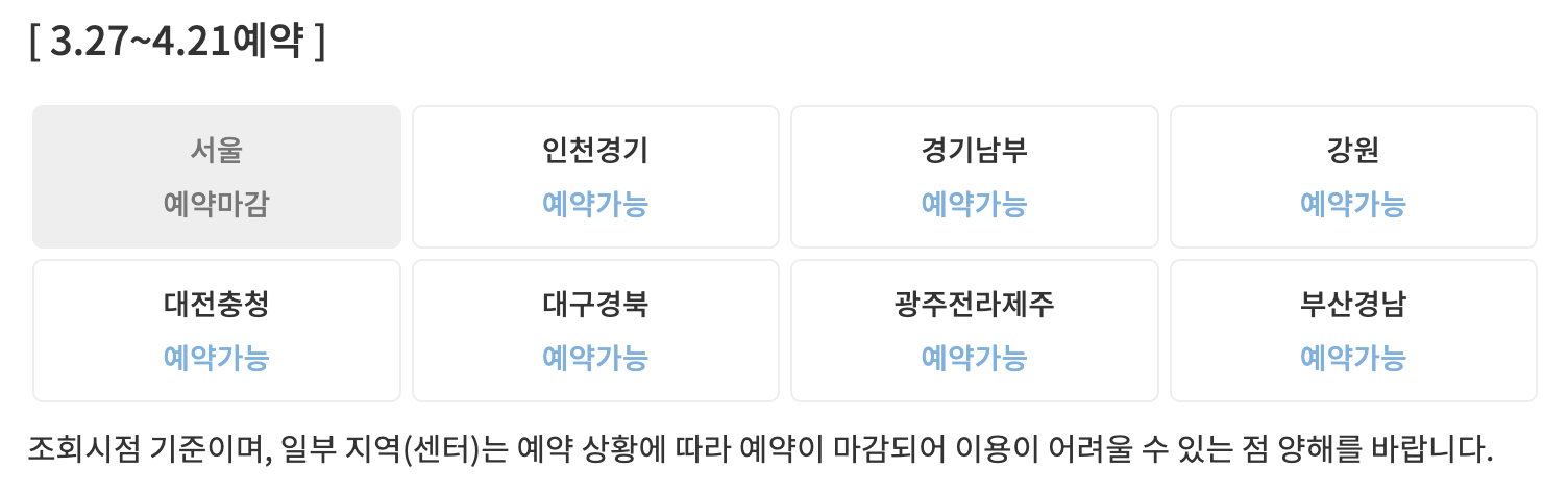 3월 24일 현재 서울은 예약마감되었으며 다른 지역은 예약가능한 상태입니다. 하지만 예약 상황에 따라 예약이 마감될 수 있으니 서둘러 상담예약하시기 바랍니다.