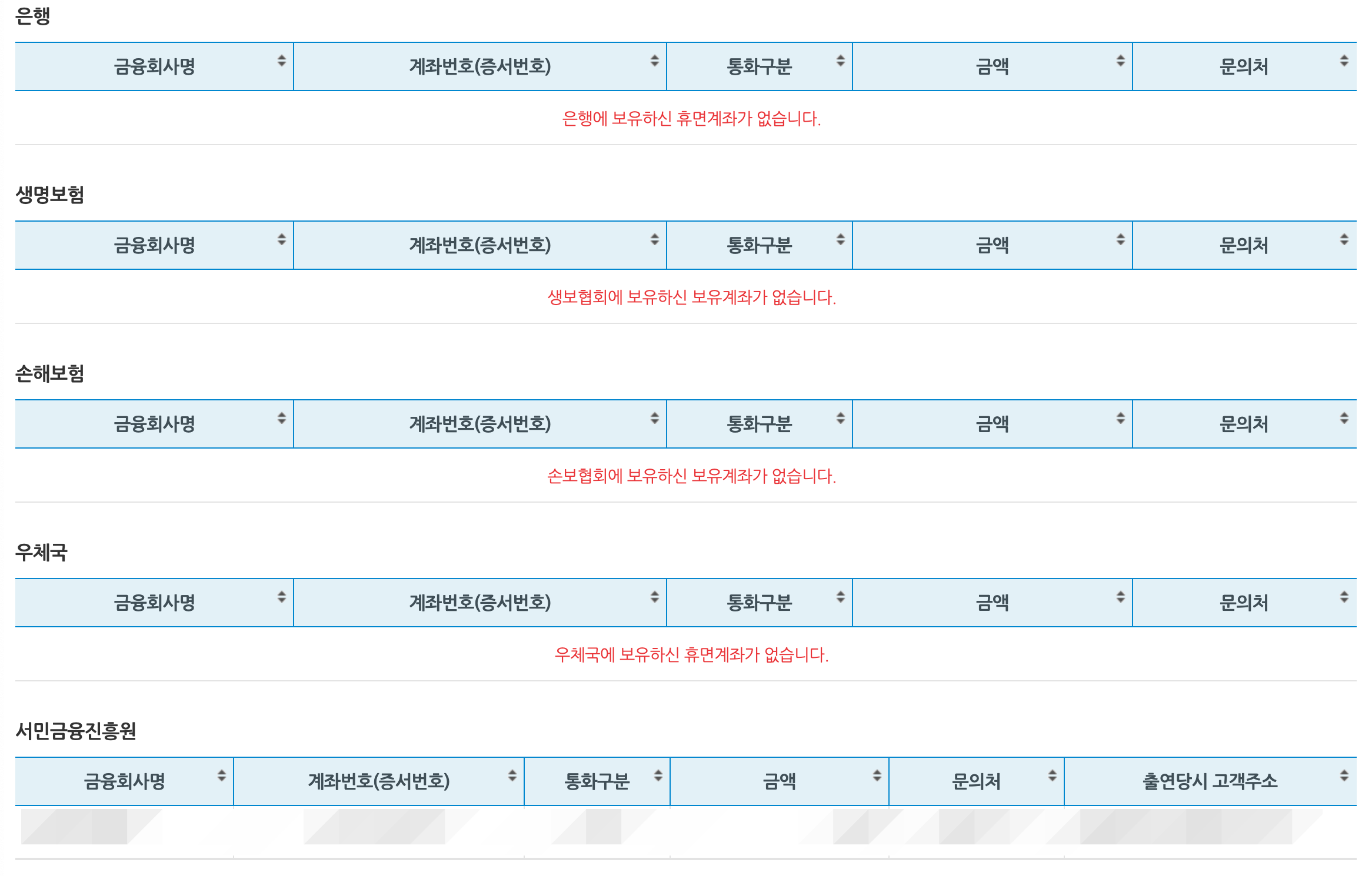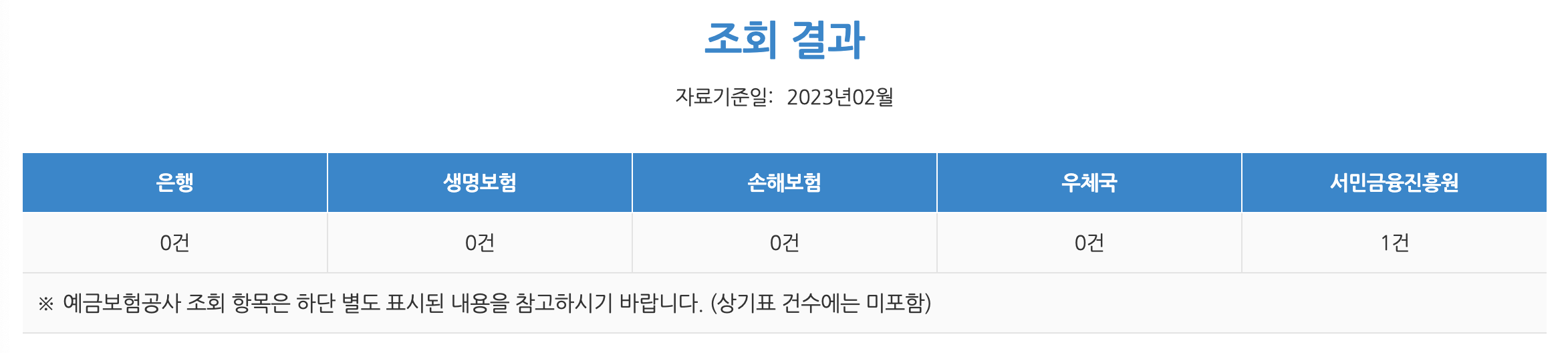 아래와 같은 조회결과를 볼 수 있습니다. 저의 경우 은행, 생명보험, 손해보험, 우체국은 0건. 서민금융진흥원에서 1건이 발견됐습니다.