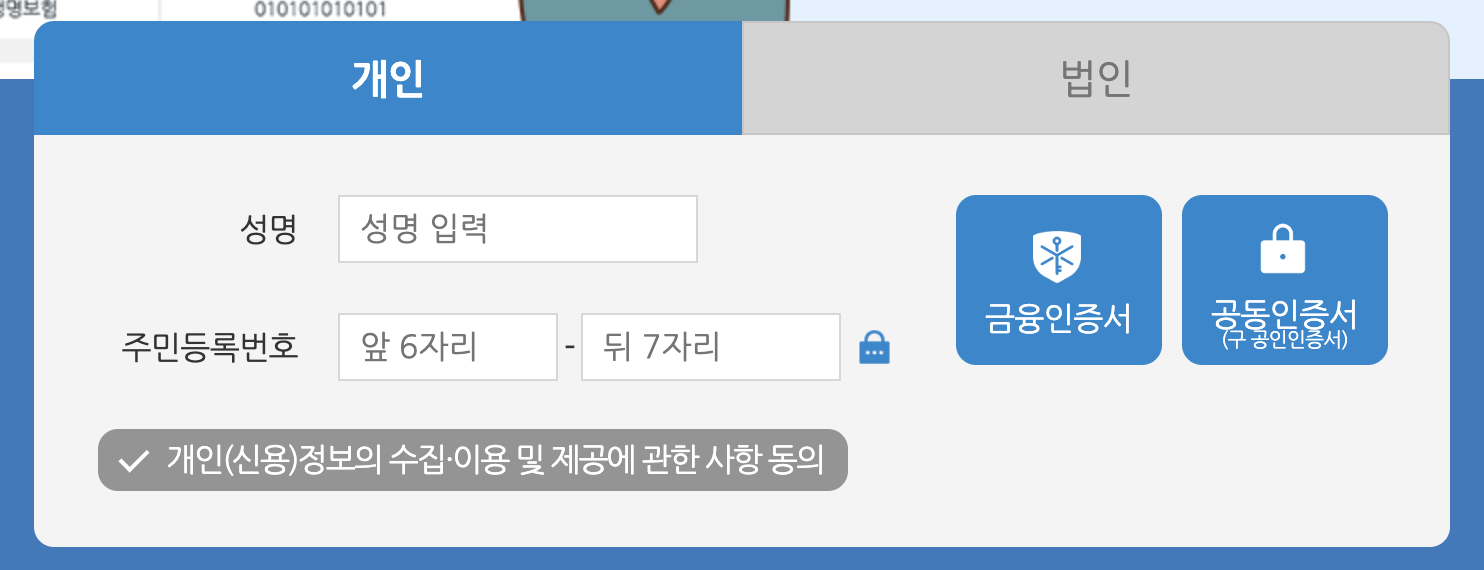 홈페이지에 접속하여 성명과 주민등록번호를 입력 후, 금융인증서 또는 공동인증서를 통하여 인증을 하면 결과가 나옵니다.