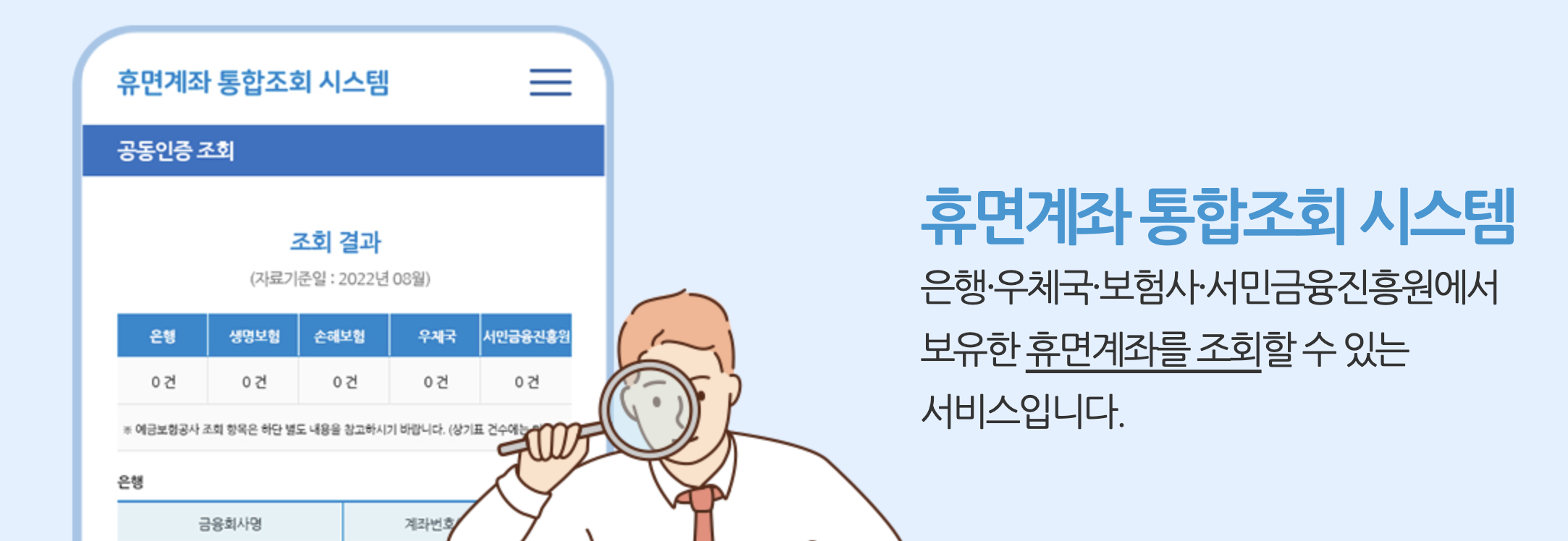 은행. 우체국. 보험사. 서민금융진흥원에서 보유한 휴면계좌를 조회할 수 있는 서비스입니다.