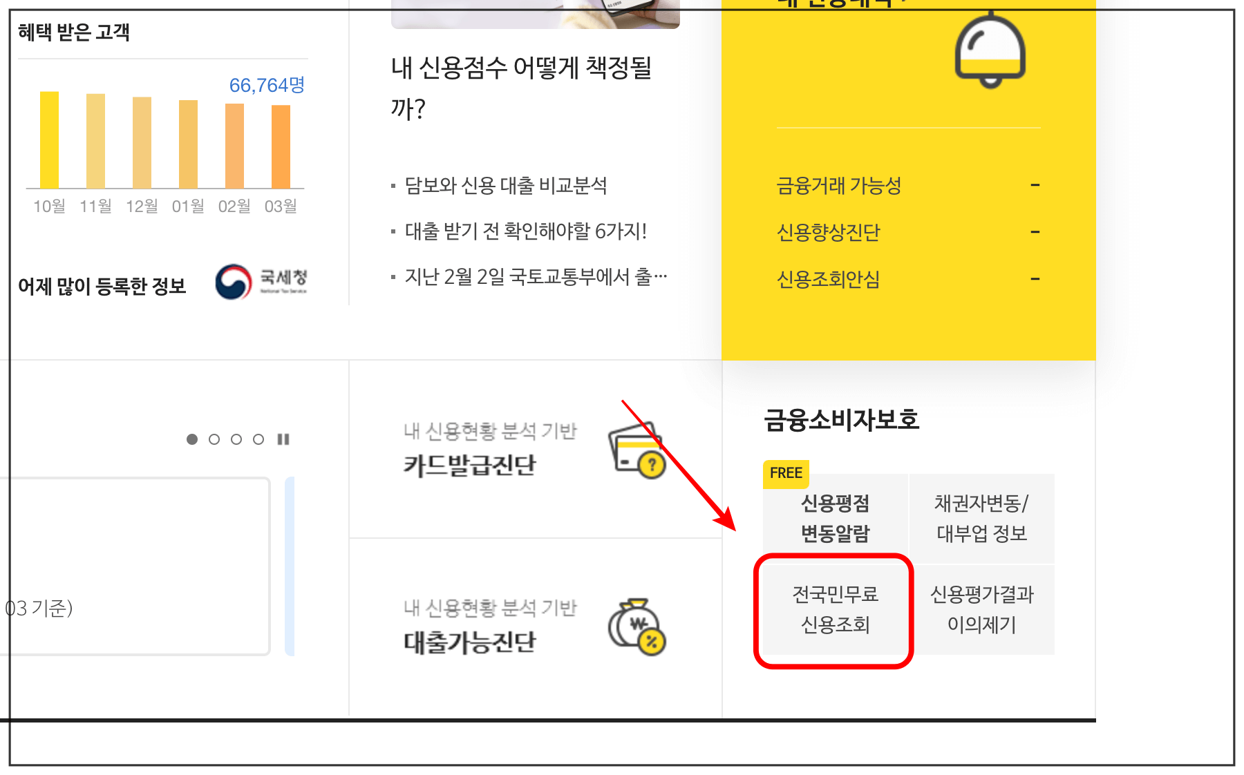 Step 2. 홈페이지 메인화면 우측을 보시면 [ 전국민무료 신용조회 ] 메뉴가 있습니다. 이 메뉴를 클릭해주세요.
