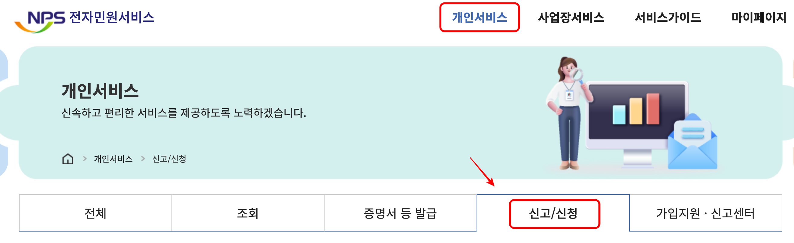 [국민연금공단] 홈페이지에서 상단 [개인서비스]를 선택해주세요. 그리고 [신고/신청] - [실업크레딧 신청] 메뉴를 선택하시면 됩니다.