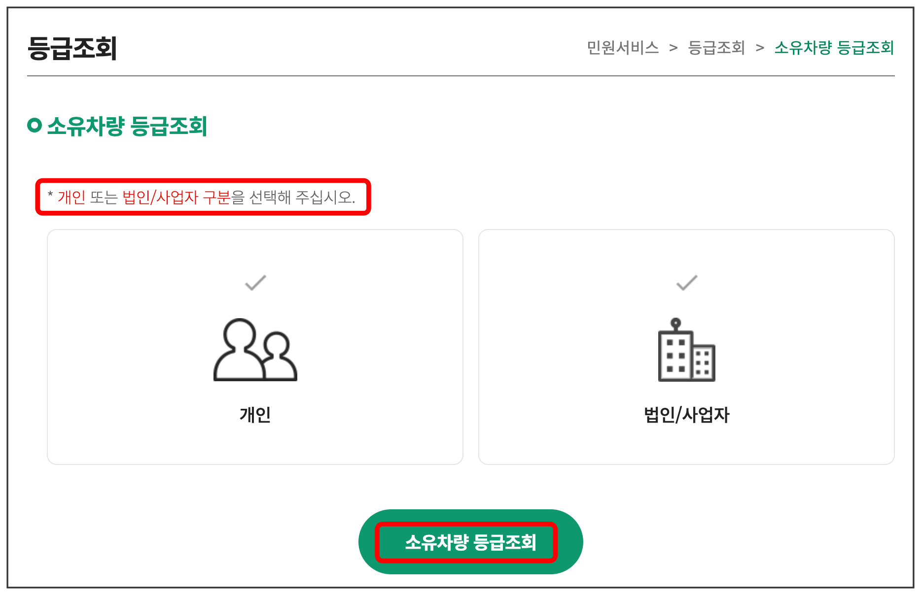 [소유차량 등급조회] 메뉴에서 개인/ 법인.사업자 중 조회할 차량의 소유 구분을 선택해 주세요.