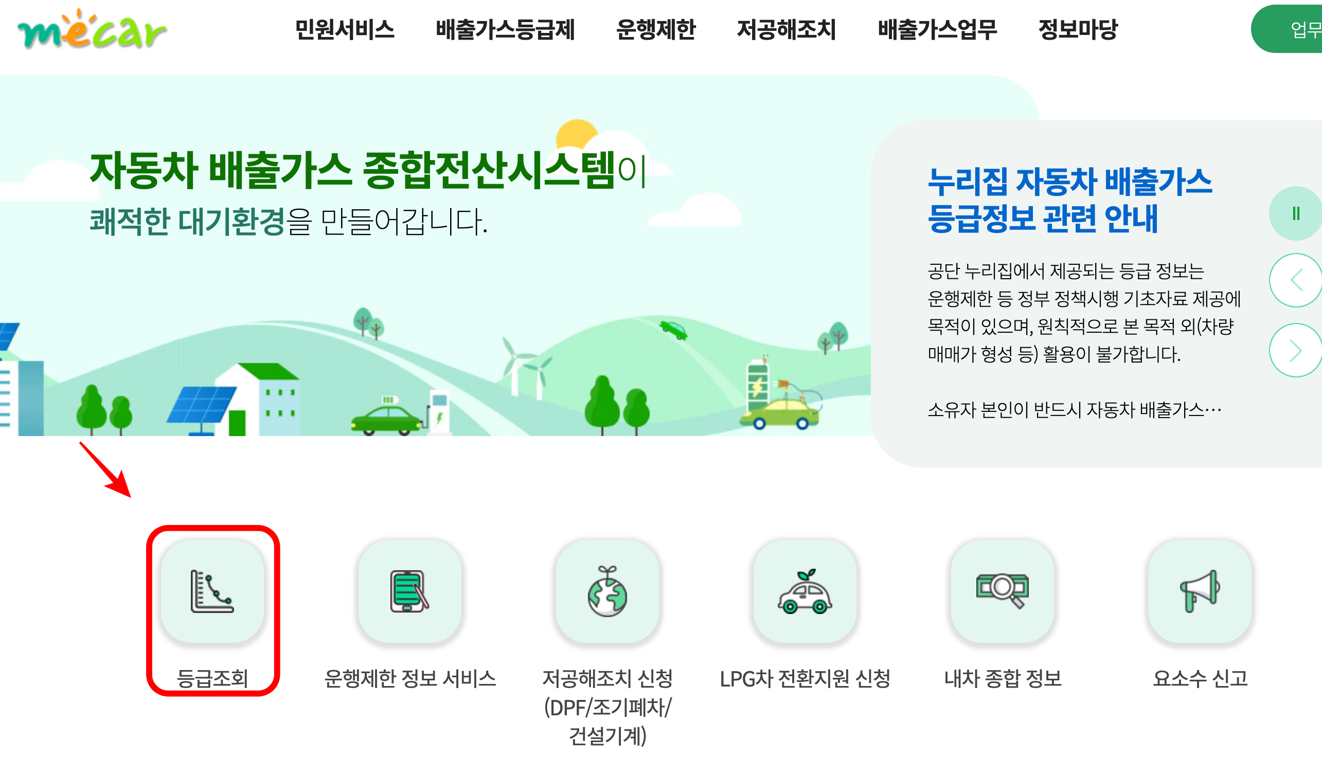 자동차 배출가스 누리집 홈페이지에 접속하면 [등급조회]메뉴를 볼 수 있습니다. 이 메뉴를 통해 조회가 가능합니다.