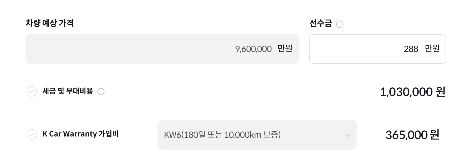 차량의 예상가격, 선수금 그리고 세금 및 부대비용에 대한 안내도 나와있어 예산을 짜는데 도움이 많이 됩니다.