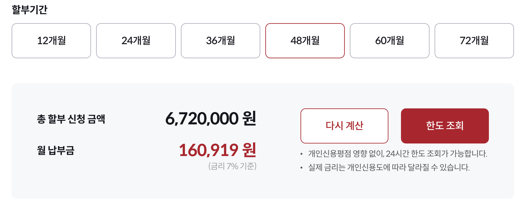12개월부터 72개월까지 할부가 가능하며 각 기간에 따른 월 납부금이 안내되어 나의 경제상황에 맞게 플랜을 짤 수 있습니다.