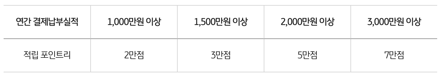 국민카드의 경우 포인트리 적립이 되는 방식입니다. 국내.외 가맹점 이용 시 0.3% 기본적립, 6대 업종 가맹점 이용 시 0.3% 추가적립 (외식,교통,통신,의류,쇼핑,특화) , 연간 납부 실적 구간별 리워드 2~7만점이 주요 혜택입니다. 할인보다는 포인트를 적립해 현금으로 바꾸거나 다른 곳에 포인트를 사용하실 분들은 국민카드를 선택하시면 되겠습니다.