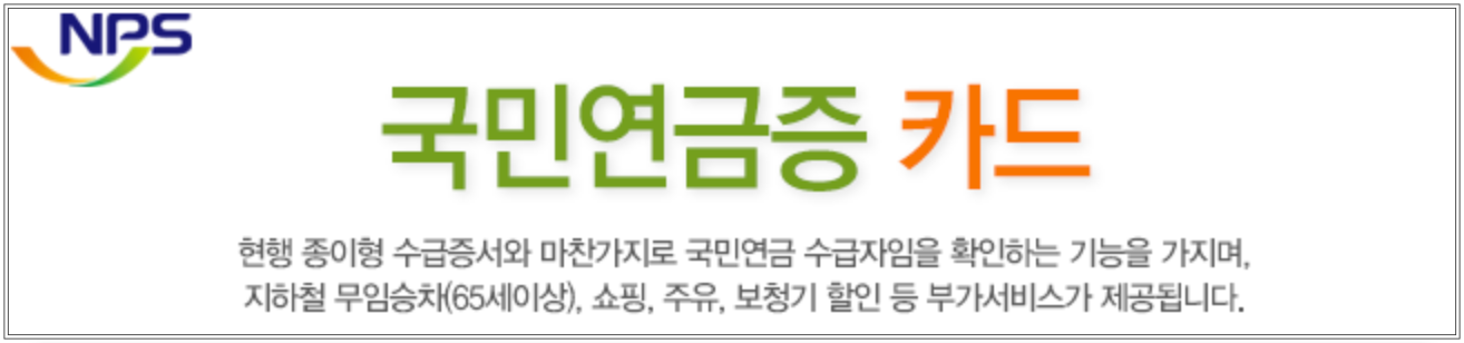 국민연금증 카드는 국민연금 수급자임을 증명하는 신분증 역할을 하며, 신용카드 기능을 겸비한 결제카드의 역할을 합니다. 또한 이 카드는 지하철, 쇼핑, 보청기 할인, 주유할인, 영화할인, 전국 유명 스파 할인 등의 부가적인 혜택을 제공하고 있으며 일정 비율을 적립해 사회공헌기금 역할도 합니다.