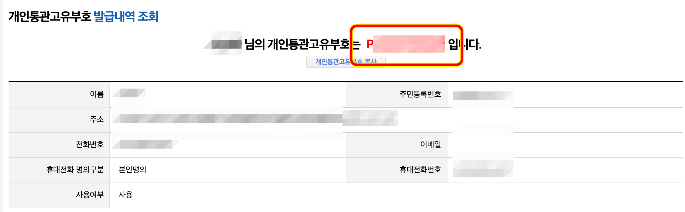 본인인증 후에는 아래와같이 개인통관고유부호 발급내역이 조회됩니다.