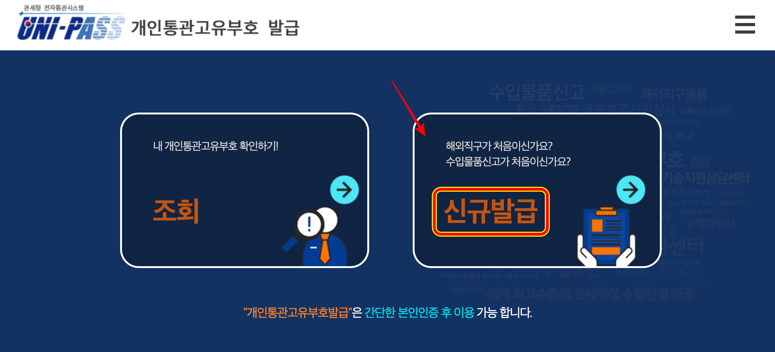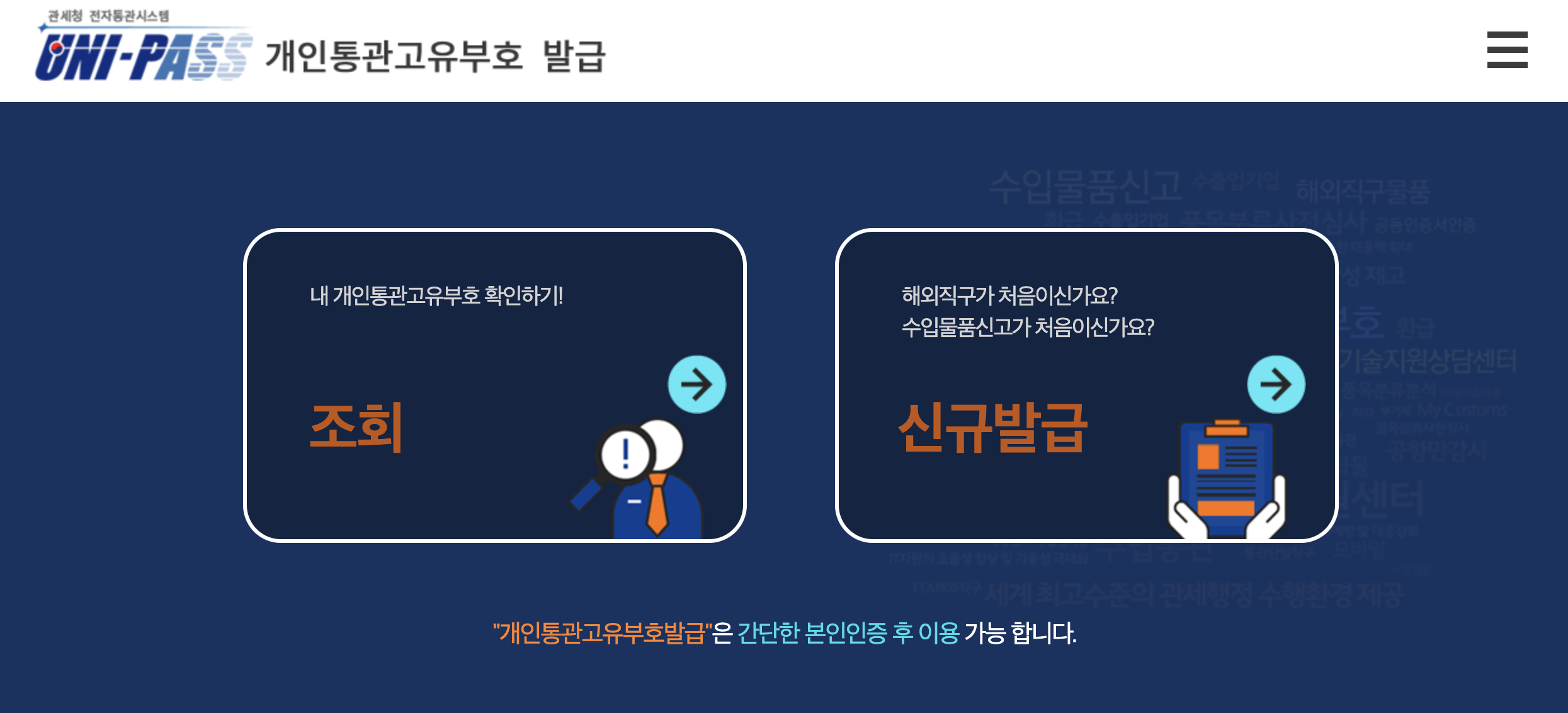 위에 안내드린 [관세청 개인통관고유부호] 홈페이지에 들어가시면 아래와 같은 화면이 보여집니다.