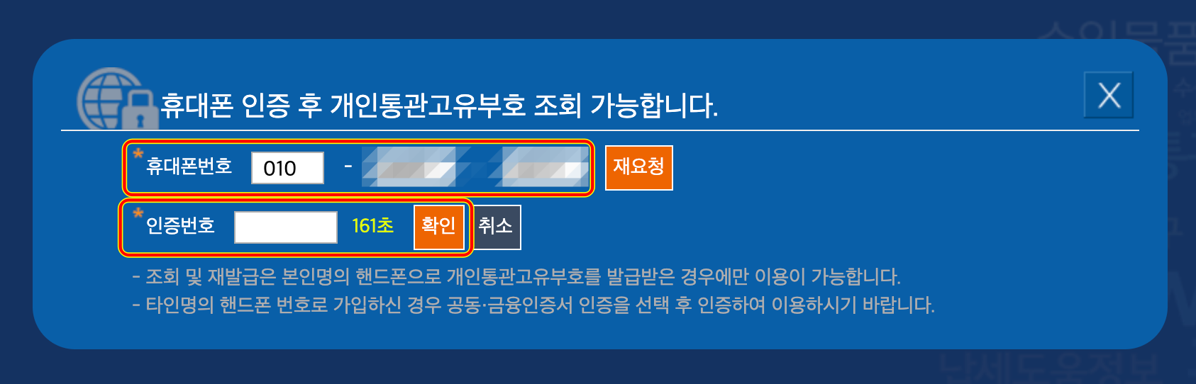 발급은 [모바일 관세청 앱] 또는 [PC 및 모바일 웹사이트]를 통하여 본인 인증을 받은 후 즉시 발급이 가능합니다. 한 번 받으면 계속 사용할 수 있는 부호이므로 잘 메모해 둬야 할 것입니다. 만약 잊어버렸더라도 관세청 홈페이지에서 조회가 가능합니다.