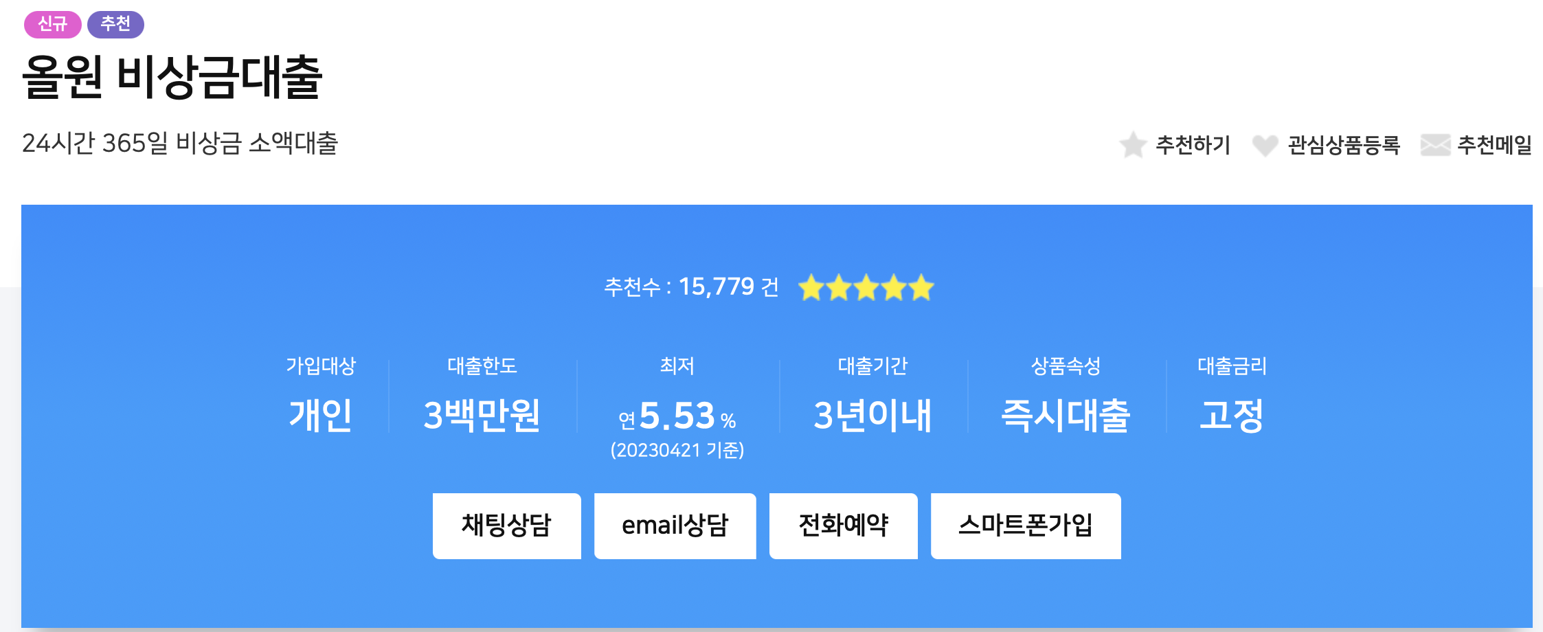 최소 50만원 ~ 최대 300만원까지 대출이 가능하며, 대출기간은 거치기간없이 3년입니다.
