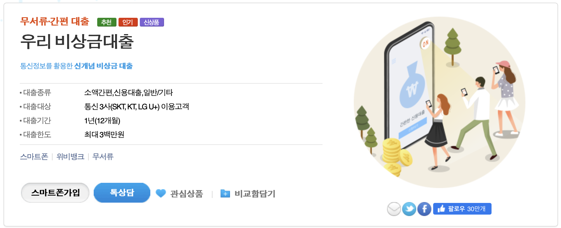 통신정보를 활용한 신개념 비상금 대출 상품입니다. 통신등급을 활용하여 직정, 소득을 따지지 않는 비상금대출입니다.
