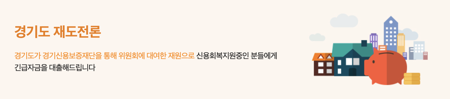 경기도 재도전론은 경기도가 경기신용보증재단을 통하여 위원회에 대여한 재원으로 신용회복지원 중인 분들께 긴급자금을 대출해주는 상품입니다.