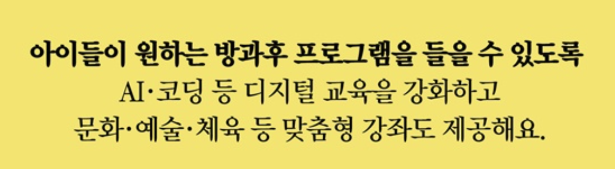문화.예술.체육 등의 분유에서 아이들이 원하는 프로그램과 소규모 수준별 고품질 강좌 등의 프로그램이 진행될 계획입니다. 고학년의 경우에는 코딩, 빅데이터와 같은 기술 관련 프로그램을 신설해 수업을 운영되어 집니다.