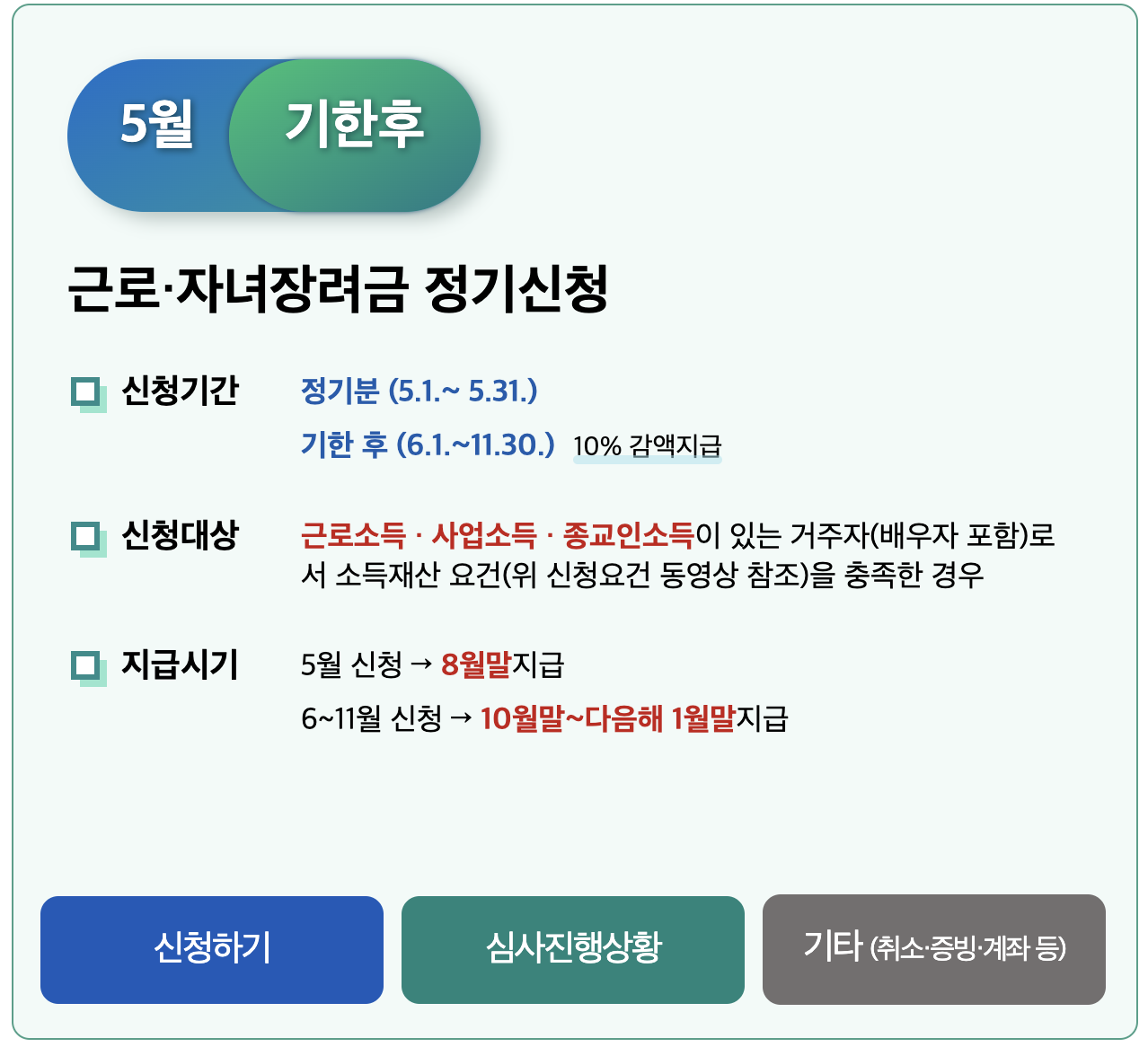 5월에 신청하면 8월말에 지급되며, 6~11월 기한 후 신청하면 10월말 ~ 다음해 1월말에 지급됩니다.