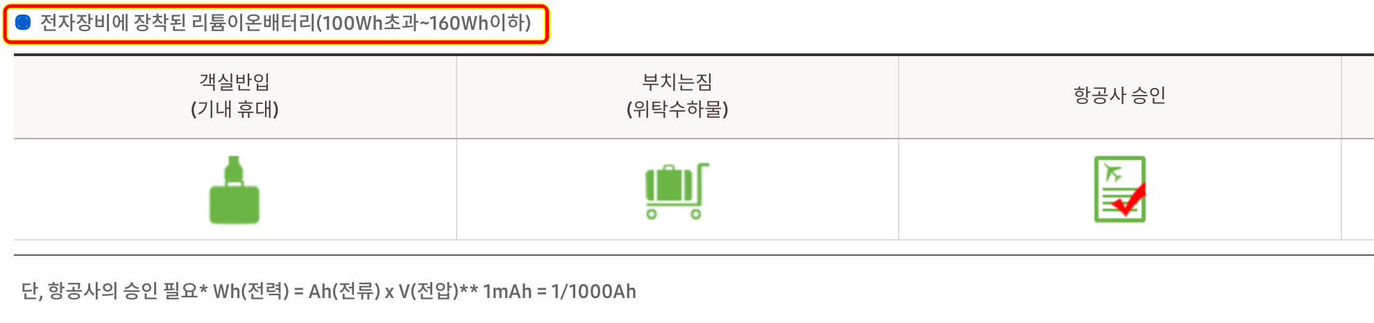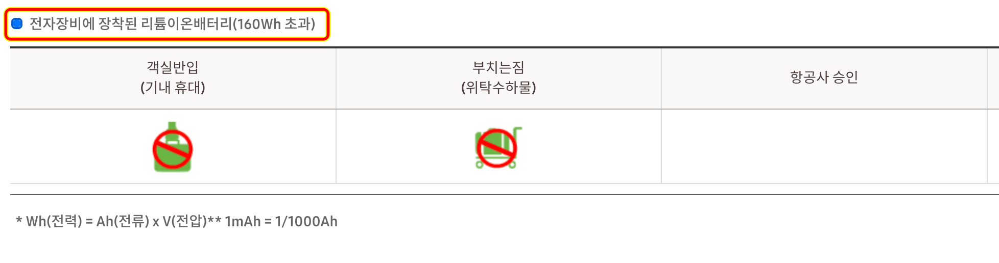 단, 리튬배터리의 경우에는 비행 중 화재가 발생할 수 있어서 기내/위탁 모두 160Wh이하만 가능합니다.