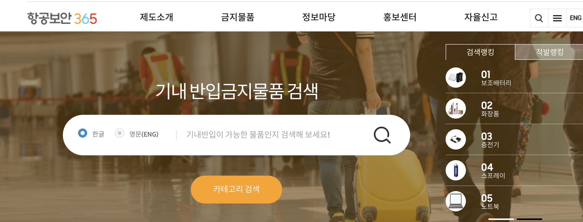 위에 간략하게 안내드렸지만, 그래도 확실하게 하고 싶다거나 헷갈리는 부분이 있다면 항공보안365 홈페이지를 통하여 기내 반입금지물품을 검색해 볼 수 있습니다. 이 항공보안365는 교통안전공단에서 운영하는 홈페이지로 비행기 탈 때 반입이 가능한 물품인지 쉽게 확인이 가능합니다.