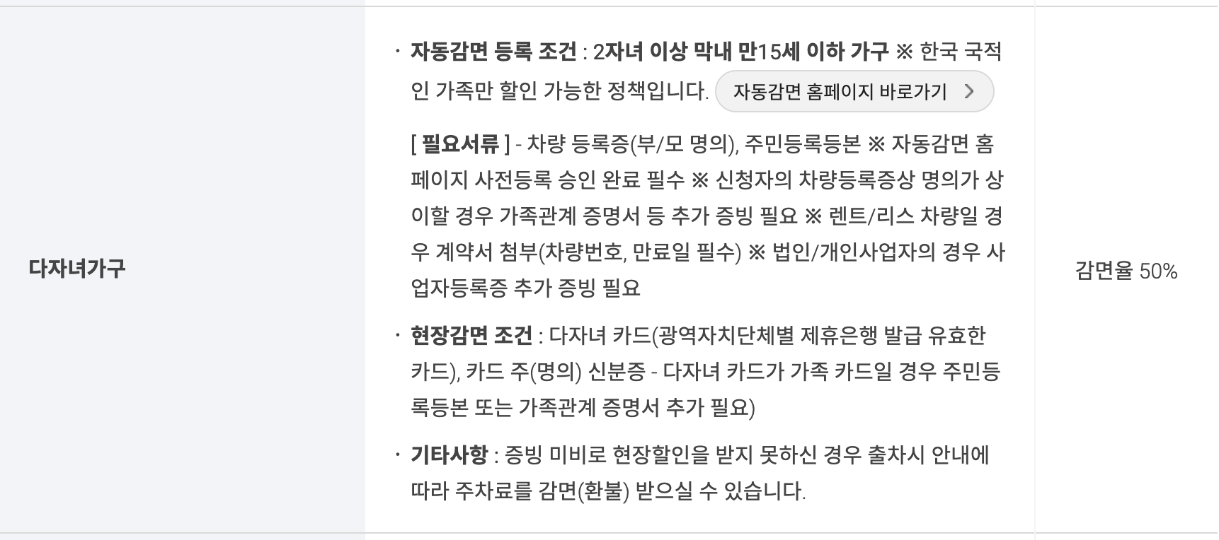 다자녀 가구 또한 50% 할인이 적용됩니다. 자동감면 조건, 현장감면 조건은 아래 표를 참고해주세요.
