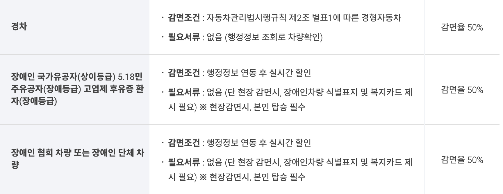 50% 할인 대상은 경차, 장애인, 국가유공자(상이등급), 5.18민주유공자(장애등급), 고엽제 후유증 환자(장애등급), 장애인 협회 차량 또는 장애인 단체 차량 등이 있습니다.