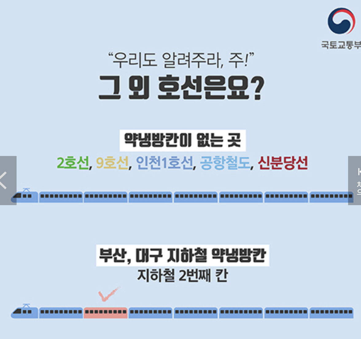 부산, 대구 지하철의 경우에는 지하철 2번째 칸이 약냉방칸입니다.