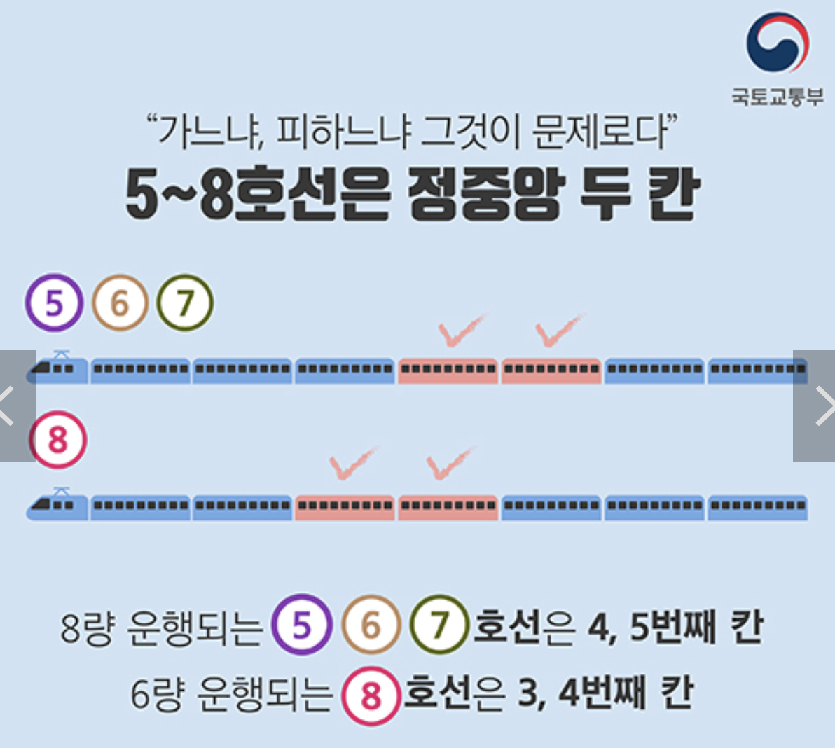8량이 운행되는 5,6,7호선의 경우에는 4번째, 5번째 칸이 정중앙이며, 6량이 운행되는 8호선의 경우에는 3번째, 4번째 칸이 정중앙 두 칸입니다.