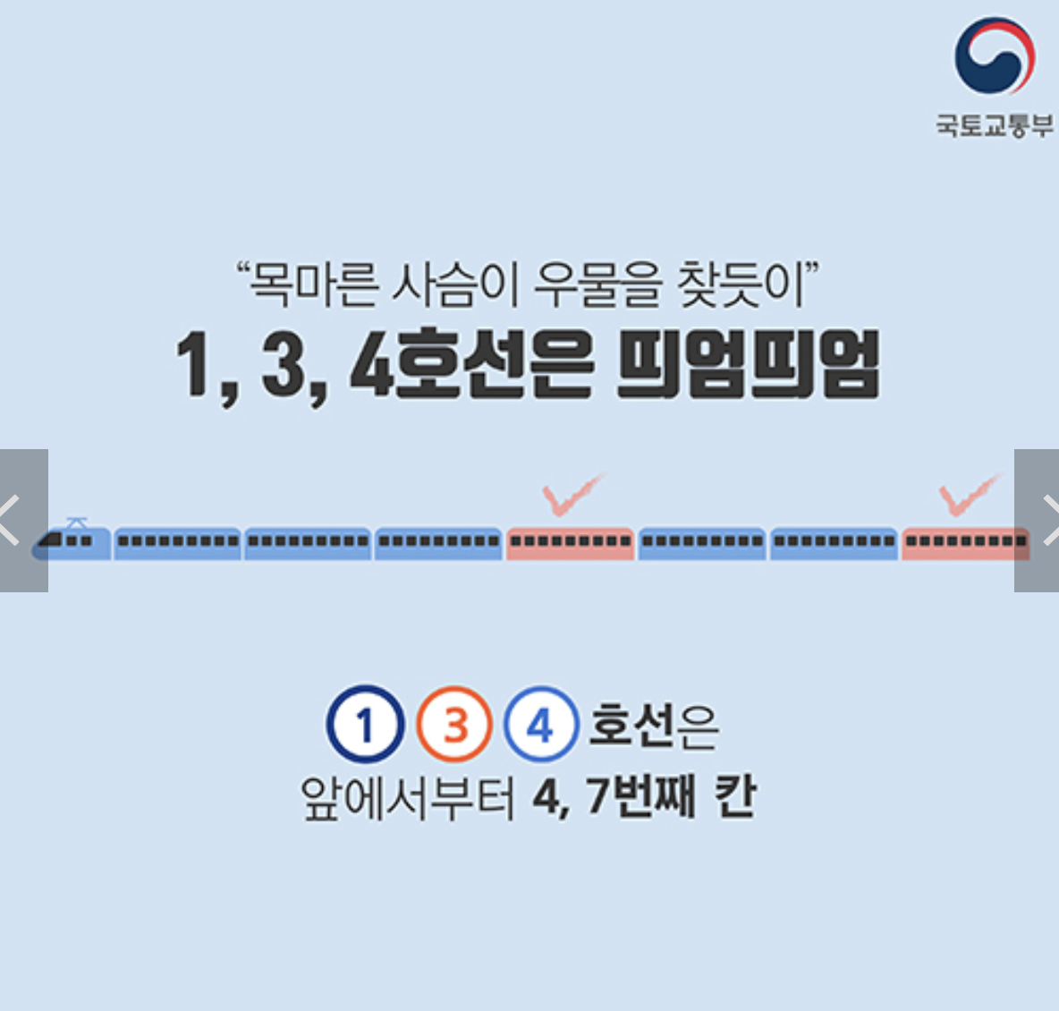 1호선, 3호선, 4호선의 약냉방칸은 앞에서부터 4번째, 7번째 칸이 약냉방칸입니다.