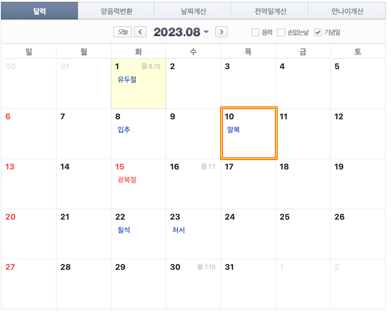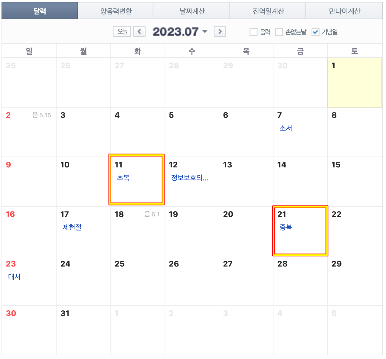2023년 초복은 7월 11일, 중복은 7월 21일, 말복은 8월 10일입니다.
