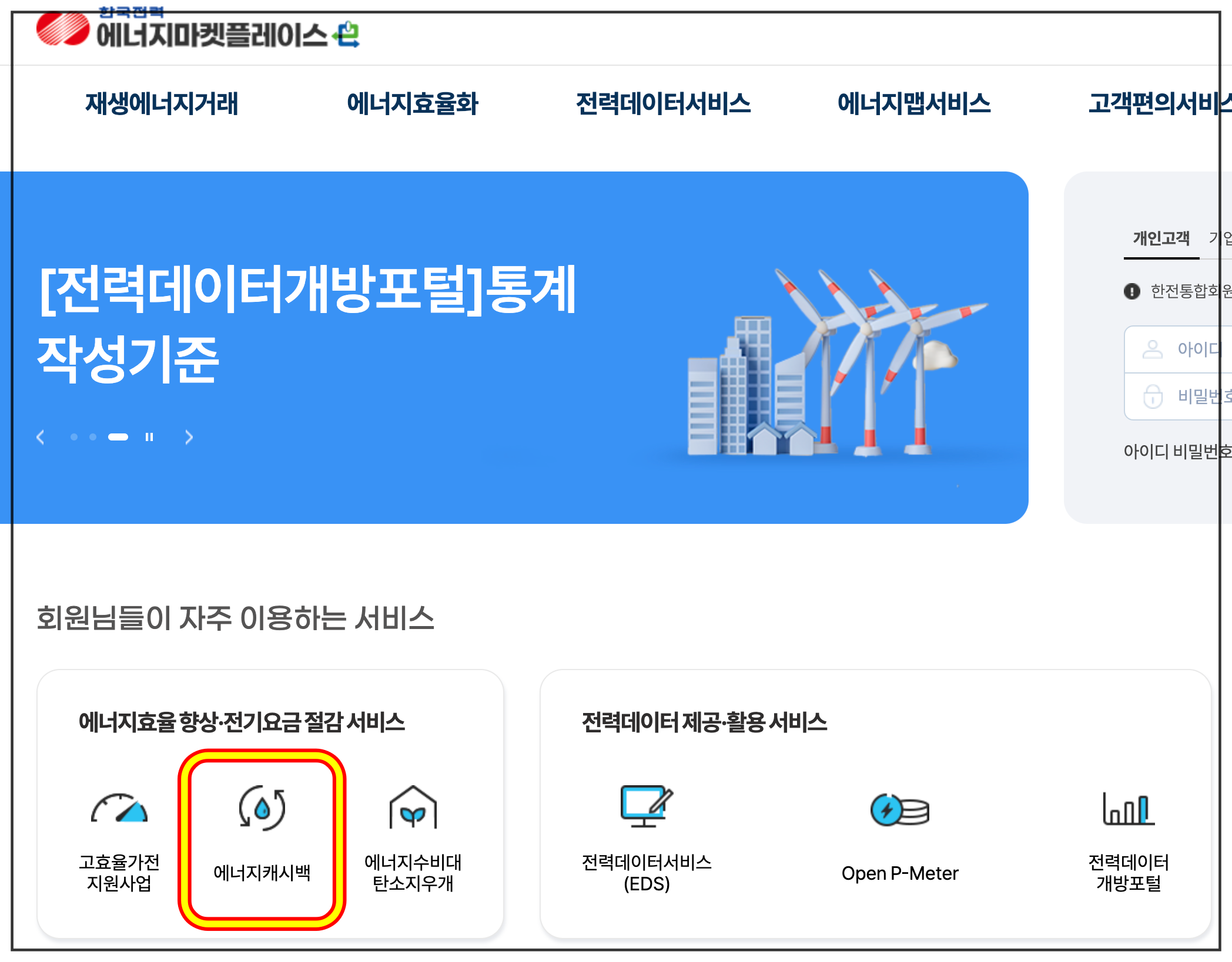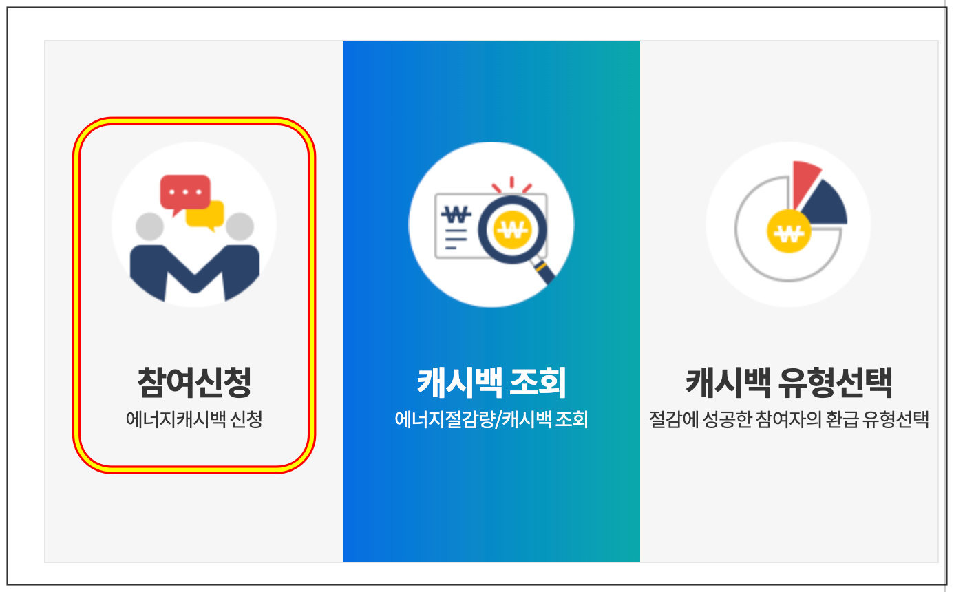 로그인 후, [에너지 캐시백] 선택 > [참여신청:에너지캐시백 신청]을 선택하시면 됩니다.