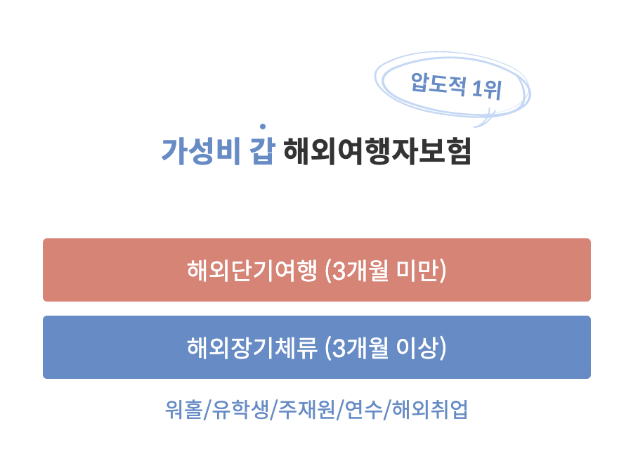 항공기 결항 및 지연, 수하물 지연도착과 항공 수하물 파손, 도난, 분실과 같은 빈번한 사고 뿐만 아니라 사망, 식중독, 특정전염병 등의 기타보장도 든든한 여행자보험. 여행 전 꼭 준비하시고 안전한 여행 되시기 바랍니다.