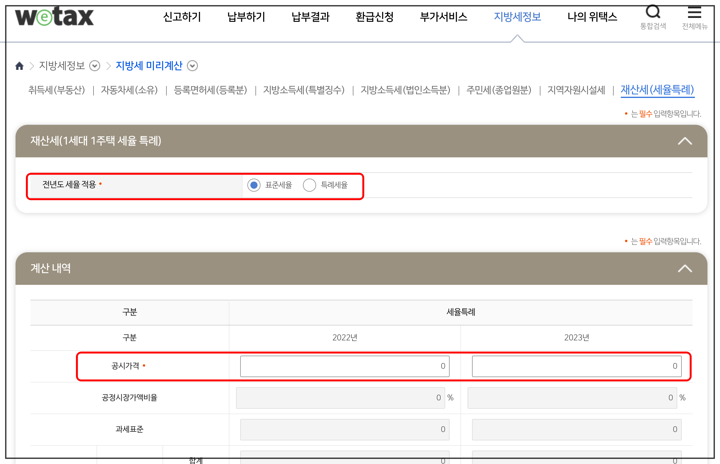 [저년도 세율 적용]에서는 1세대 1주택에 해당하면 [특례세율] 선택, 그 외의 경우에는 [표준세율]을 선택하시면 됩니다. 그리고나서 아래 공시가격을 입력하시기 바랍니다.