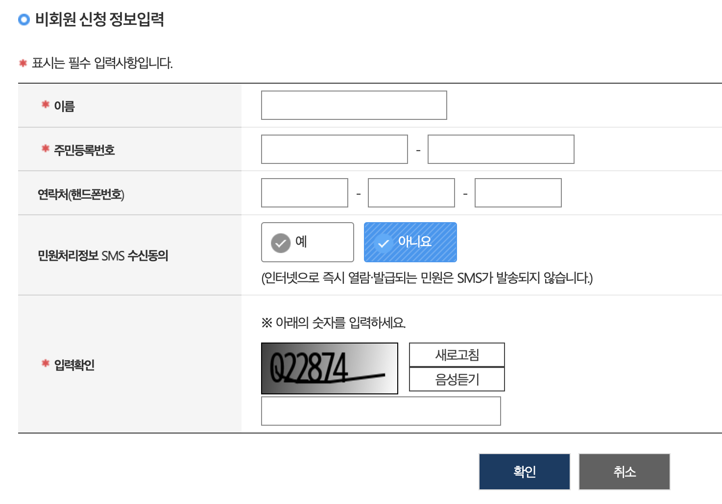 비회원은 정보수집 이용동의에 체크하고, 이름/주민등록번호/입력확인을 기입 후, [확인]을 눌러주세요.